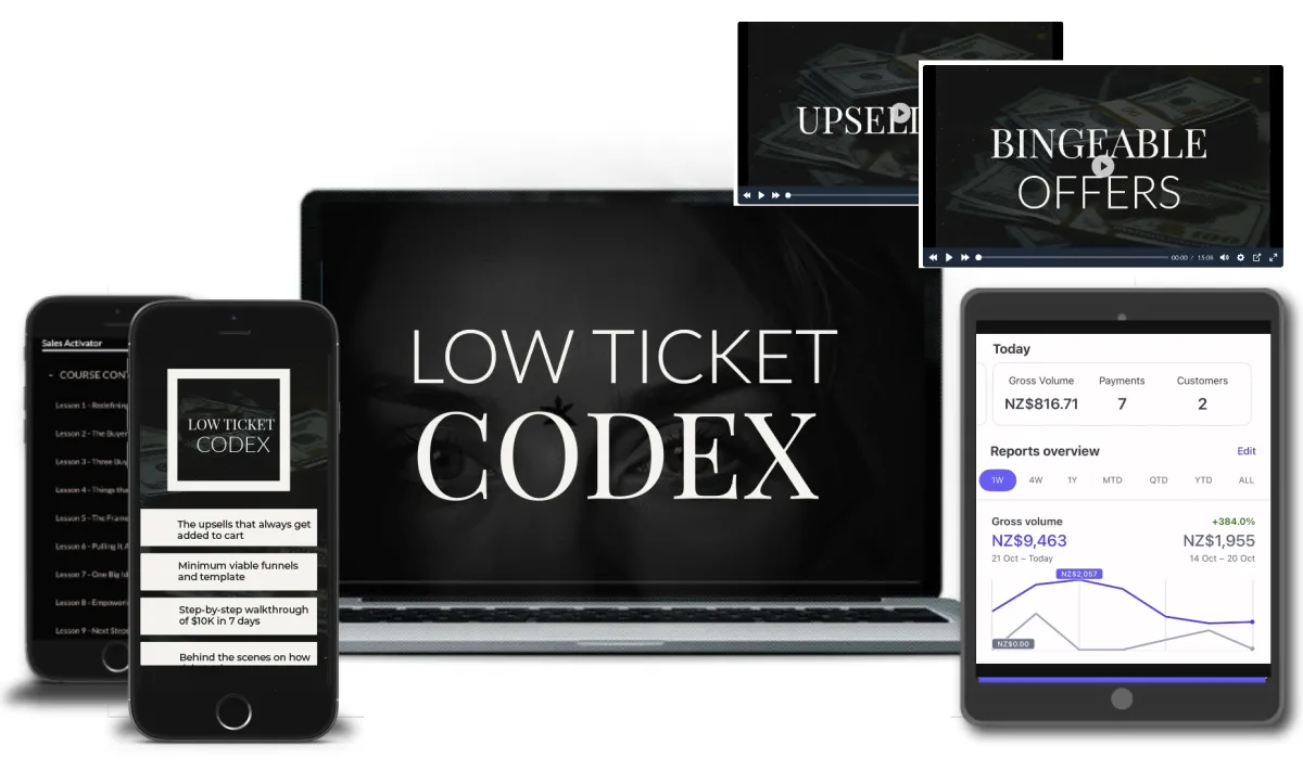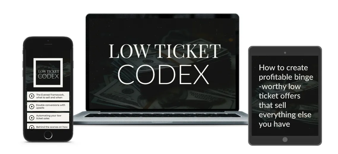 The Low Ticket Codex includes a 9-part video training with exercises to help you start your low ticket ecosystem as profitably as you can (or fix an existing low ticket offer funnel)